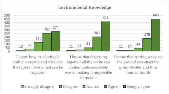 Environmental knowledge refers to the knowledge, information and skills necessary for individuals to properly sort waste, to understand its impact on the environment, along with their knowledge of selective collection programs, collection stations and infrastructure provided by the authorities [34]. According to Meng et al. [34], environmental knowledge has a significant impact on consumer behavior in China.