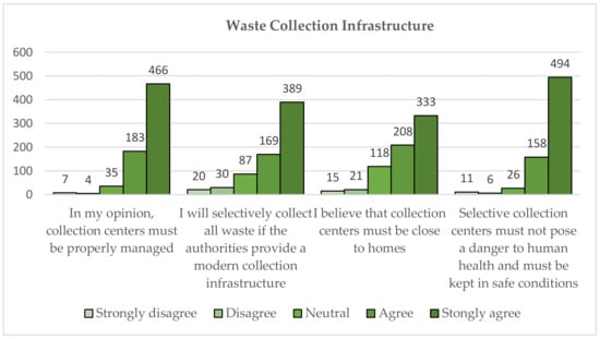 Selective collection infrastructure refers to the access of individuals to collection stations, their condition, their physical storage capacity and the number of the available collection stations [34]. It has been determined that selective collection infrastructure has a significant role in determining consumer behavior [34].