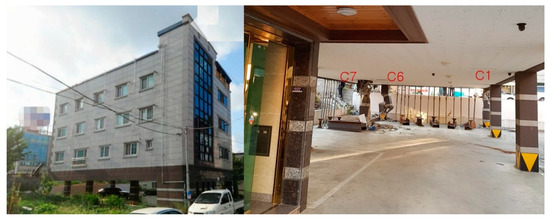 A typical piloti-type building, located in Pohang Province of South Korea, was used as the reference to create the numerical model. Most piloti-type buildings are low-rise and are constructed with column components on the first floor to make space for parking and commercial services. The upper floors are constructed as moment-resisting frame and/or shear walls. This design creates structure irregularities vertically and horizontally. In addition, existing piloti buildings are typically designed with deficient amounts of reinforcements and lack seismic details, and as a result, fail to meet current standards. The columns on the first floor are extremely vulnerable and expected to experience significant force demand when hit by severe earthquakes.