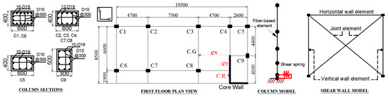Column, shear wall in the numerical model, and the target building’s first-floor plan view and column sections.