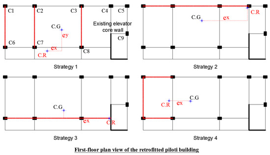 Using additional shear walls on the first floor, four retrofitting plans were created. The locations of the retrofitting shear walls were determined based on architectural considerations, to maintain the parking function of the first floor and structural aspects. In terms of structural aspects, the shear walls were intentionally added adjacent to columns C1, C6, and C7 (see Figure 1 and Figure 2), which were severely damaged during the Pohang earthquake event. The proposed retrofitting plans were expected to mitigate the column damage and improve their seismic response.