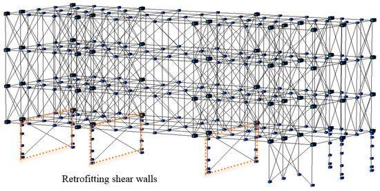 Figure 3 shows four retrofitting strategies using additional shear walls, presented graphically. A three-dimensional piloti building model of strategy 1 is illustrated in Figure 4. The number of additional shear walls was fixed at three. It is noted that finding the most optimal retrofitting plan for the piloti building is beyond the scope of this study, since it requires examining several retrofit plans with different numbers and locations of shear wall. The present research provides a parametric analysis and evaluation using limited retrofitting plans, based on the architectural function and column site damage evidence that was collected.