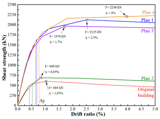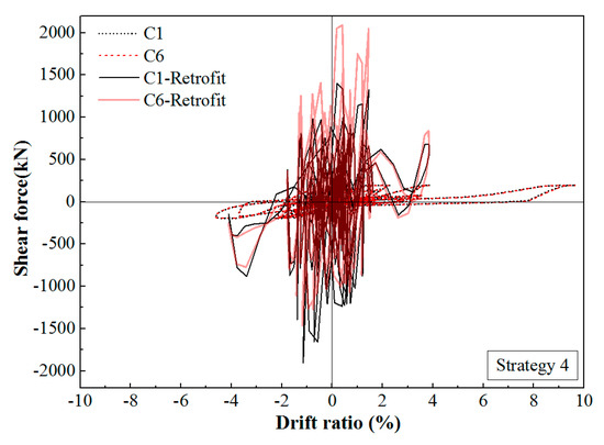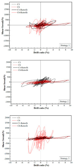 Figure 7 shows a comparison of the hysteretic shear force–drift ratio responses of columns C1 and C6 in the original building with respect to the four retrofitting strategies. Columns C1 and C6 are the most vulnerable columns in the entire building, therefore, improving their seismic response was considered to be the main task of this research.