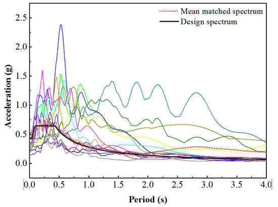 A suite of 14 ground motions was selected and is presented in Table 3 for the nonlinear time history analysis (NTHA) of the piloti building. In this research, incremental dynamic analysis (IDA) was adopted to develop the fragility curve. Each earthquake excitation was scaled from a peak ground acceleration (PGA) of 0.05 g to 1 g with 0.05 g increments (g is gravity acceleration). Figure 6 illustrates the piloti building design spectrum and the response spectra of the input ground motions. The calculated response spectra were compared with the design spectrum of the building based on the Korean Building Code. To evaluate the retrofitted building’s seismic response in terms of hysteretic curves, stiffness degradation, interstory drift ratio, and so forth, the results from only one input ground motion are presented. Results obtained from a total of 280 ground motions were used to develop the fragility curves, which is the main scope of this research.