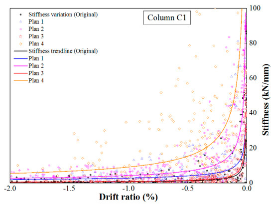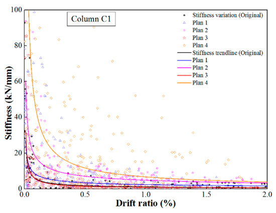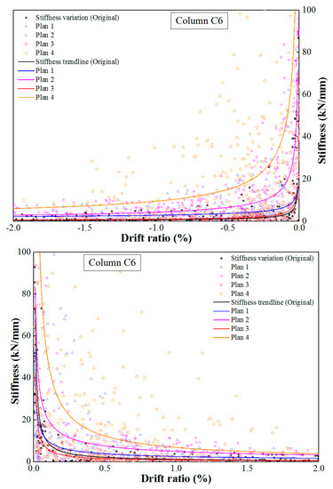 Figure 8 and Figure 9 depict the degradation in stiffness of columns C1 and C6, respectively. The variation in stiffness during the time-history analysis is complicated. Hence, degraded column stiffness is presented using transparent power function trendlines. In general, for both columns C1 and C6, a rapid degradation in initial stiffness was observed in both negative and positive directions. The most pronounced effect can be seen in Plan 4, where initial stiffness was increased. The intensity of influence decreased in the order of Plan 2 and Plan 1. In addition, no significant effect was found for Plan 3, where the stiffness degradation was similar to that of the original columns. As the drift ratio increased, the influence intensity decreased.
