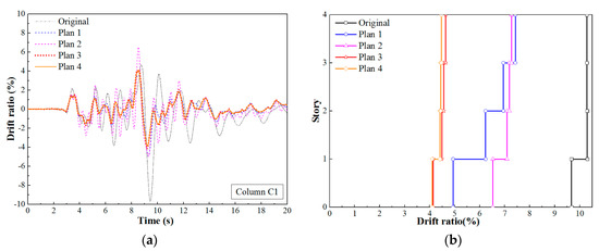 Figure 10a illustrates the drift time-history response of column C1 in the weak direction of the building, while Figure 10b presents the maximum interstory drift ratio. The results from the previous section indicate that the drift ratio demand on the first floor significantly decreased, by 57%, for Plans 3 and 4, and by 48% and 32% in Plans 1 and 2, respectively. The beneficial effect diminished in the order of Plan 4, 3, 1, and 2. However, in the upper stories, Plan 1 exhibited a great increase in drift ratio of 50% and exceeded that of Plan 2 at roof level. Meanwhile, similar responses can be observed for Plans 3 and 4.