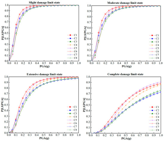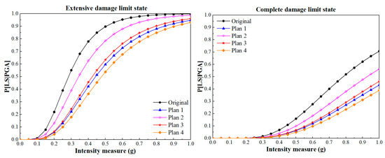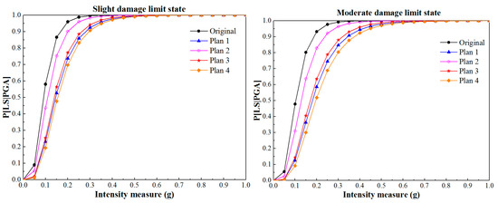 In order to evaluate the beneficial effect from each retrofitting strategy, the fragility curves of column C1 are depicted in Figure 12. In all cases of limit states, Plan 4 clearly reduced the probability of exceeding the damage threshold with respect to the original fragility curves. The influence intensity decreased in the order of Plan 1, 3, and 2. The results indicated that Plans 4 and 2 were the most and least effective retrofitting strategies, respectively, among the proposed plans. Plans 1 and 3 exhibited a similar improvement in vulnerability, while Plan 3 probability slightly exceeded that of Plan 1. As the probability decreased, the median value of the fragility curve, which is defined as the PGA associated with a 50% probability of exceeding the damage state (median PGA), increased.