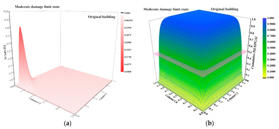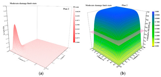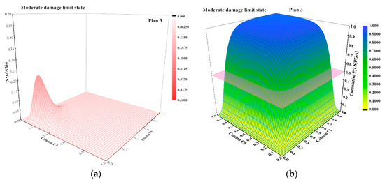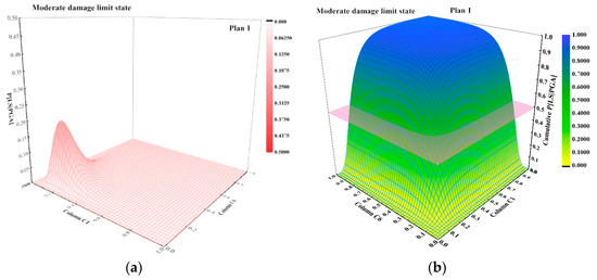 Figure 13 illustrates the joint probabilities of the event when columns C1 and C6 in the original building both exceeded the Moderate limit state. Those of the retrofit Plans 1–4 are presented in Figure 14, Figure 15, Figure 16 and Figure 17, respectively. The relationship between Figure 13a,b is that the cumulative probability (see Figure 13b) at a given IM (IM is identical for both C1 and C6) is determined by the volume created by the surface over the relative IM region (see Figure 13a). In general, observing the surfaces (see Figure 13a, Figure 14a, Figure 15a, Figure 16a, Figure 17a), it indicates the narrow ridge shape associated with a more vulnerable response since the maximum probability was reached within a narrow range of IM (in columns C1 and C6). The plane where the cumulative probability reached a value of 50% was used to determine the median PGA. In the original building, the median PGA was 0.14 g, and it increased by 71% to 0.24 g, 0.17 g (21%), 0.22 g (57%), and 0.26 g (85%) for retrofit Plans 1, 2, 3, and 4, respectively.