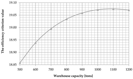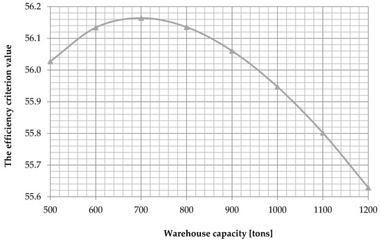 The use of the bisection root search procedure with an accuracy of 100 allowed us to determine that the optimal warehouse capacity equals to tons. The values of the efficiency criterion representing the described set of parameters are shown in Figure 3.