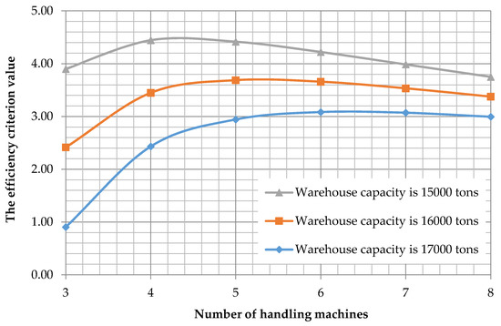 Dependence of the efficiency criterion on the warehouse capacity (three handling machines).