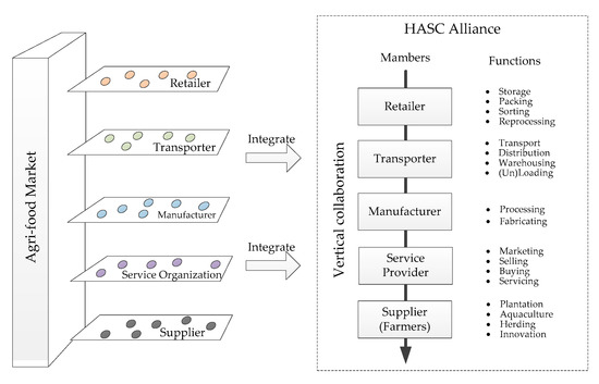 Organizational form is the internal structure of an alliance (organization), which largely determines how the organization functions and how the participants carry out their functions [97,98]. The agri-food supply chain includes the suppliers (farmers), service providers, manufacturers, transporters, retailers, and consumers. A generic supply chain at the organization level with different functional layers is presented in Figure 1 (left side) [99]. Each firm is positioned in a layer with its own supply chain-related functions (e.g., producing, manufacturing, and transporting) (Figure 1, right side). As shown in Figure 1, the HASC alliance proposed in this study involves closer co-ordination that vertically integrates one or more firm(s) from each functional layer of the supply chain. Such an alliance arrangement breaks the boundary between the firms at different layers and thus allows various functions to be integrated as a streamlined supply chain with the total function of agri-food home delivery. Each firm in the chain can entirely focus on fulfilling its own business (function). For example, the e-commerce company would oversee the trade-related activities, such as marketing, selling, buying, and servicing of the agri-food products.