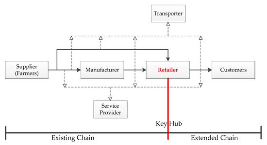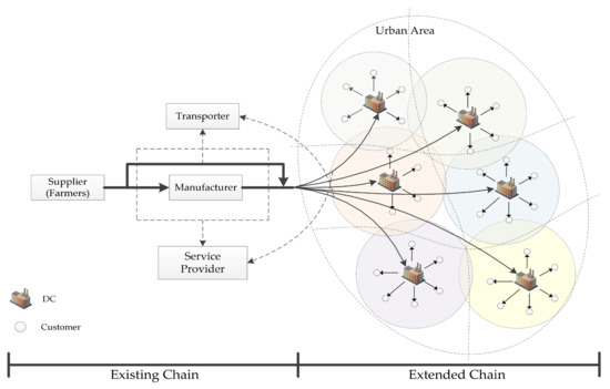 Figure 3 shows an example of a semi-centralized extended supply chain. Several physical stores belonging to the participant retail companies are selected from different regions in the urban area to form a DC network. Each store will serve the customers living in its range of operation. Thus, the whole urban area could be covered by the DC network. Based on this DC network, the agri-food can be simultaneously transported in bulk to each DC point through multiple trucks. Then, after an efficient, professional, and standardized reprocessing process (sorting, packing, and encasing), the fresh agri-food can be directly delivered to the end customers to finally fulfill the orders. This semi-centralized extension strategy not only has the aforementioned three advantages of the centralized extension strategy, but also alleviates the impact of high costs caused by the DC construction and distant distribution, and hence provides a stable base for the alliance development.