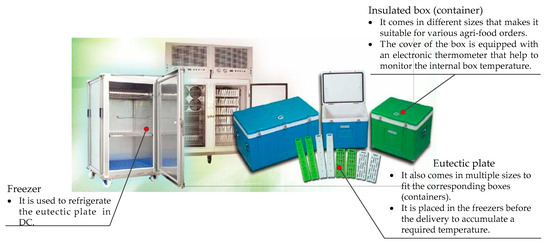The MTJD technique was developed by the Energy and Resource Laboratory, Industrial Technology Research Institute in Taiwan [101]. As shown in Figure 4, the MTJD system is equipped with multiple-size insulated containers (boxes) and replaceable and reusable eutectic plates (a type of cold accumulator). Eutectic plates of different temperatures and sizes are utilized in standardized cold insulated boxes and cabinets to maintain precise temperatures. The eutectic plates accumulate cold through freezers installed at terminals (DCs). The containers with cold accumulators are then used in regular vehicles, which enhance flexibility. Additionally, the whole system is complemented with advanced radio frequency identification (RFID) technology, which can help in food tracking, identification, and device recall [102]. Due to the reusability and flexibility of such cold devices, the MTJD system has a great potential to minimize the investment in food storage and the cost of transportation in the logistics system while maximizing compartment utilization and logistics performance (long service-life); additionally, it is environmental friendly.