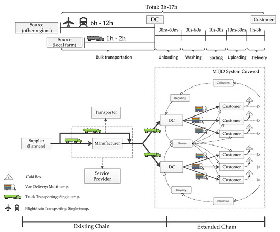 As shown in Figure 5, the MTJD system is primarily applied in the last-mile delivery process, covering the extended part of the supply chain. In each regional DC, the primary commodity (raw or processed agri-food) will go through a series of reprocessing steps, such as sorting, washing, and packing. Thereafter, the reprocessed food will be encased in an insulated box with pre-refrigerated eutectic plates to meet the multiple temperature requirements of different types of agri-food. Next, the van will be loaded with preordered agri-food and will deliver each order to the corresponding location (customer’s home or workplace). The food will be handed over to the customer at the appointed place; thus, the order will finally be fulfilled. The empty box will be brought back to the DC by the van to be reused in the next cycle. In contrast, if the customer cannot reach the appointed place on time (they may have a temporary emergency), the box can be placed in that place for the customer. Specific couriers will be assigned to collect empty boxes that may not be brought back on time. During this whole process, no matter whether it is the in-time-taking or the delayed-taking, the freshness of the agri-food can be preserved entirely by using the insulated containers and eutectic plates. The whole MTJD system is modeled in such a way that the material flows between regional DCs and their customers, forming a partial closed-loop chain. Moreover, the top of Figure 5 also shows the time that is possibly taken at each stage of processing. If it promises an effective handover between two connected stages, the duration of the entire transporting process from the source area to customers would be within 17 h (excluding the tasks at the source area, e.g., picking). This time is much less than the minimum time that an agri-food holds its freshness in a cold environment—24 h.