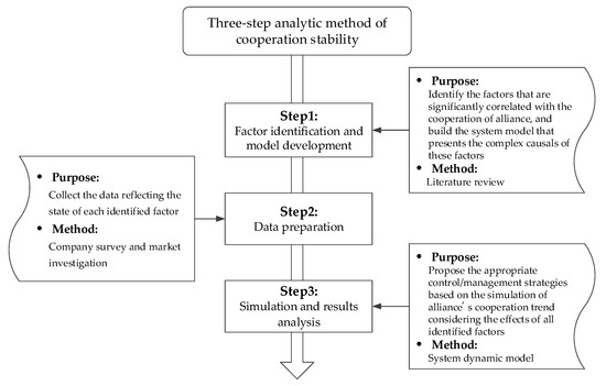 In this section, the study attempts to propose a three-step analytical method based on the systems thinking theory. The framework of this method is shown in Figure 7. As shown in the figure, the three steps include: (1) factor identification and model development, which is intended to identify the factors that are significantly correlated with the cooperation stability of alliance, and build the system model that presents the complex causals of these factors; (2) data preparation, which aims to collect the data that reflect the state of each identified factor through the implementation of survey and market investigation; (3) simulation and result analysis, which is expected to propose the proper control/management strategies based on the simulation of alliance‘s cooperation trend considering the effects of all identified factors.