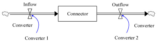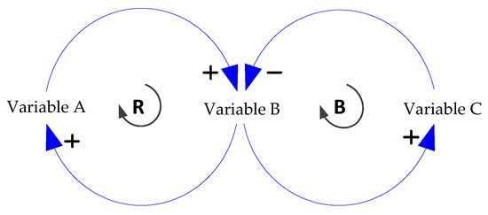 Typically, SD models are interpreted through diagramming tools, such as causal loop diagrams (CLDs) and stock-flow diagrams (SFDs) [111]. CLDs are able to map how the system is dynamically influenced by the interactions of all the variables. A CLD links system variable by arrows. These arrows denote the direction of influences among the variables. Each causal link is assigned a polarity, either positive (+) or negative (–), to indicate how the dependent variables are influenced by the independent variables—positive for direct and negative for an inverse influence. An illustrative CLD is depicted in Figure 8. The CLDs can successfully describe the basic logical structures; however, to conduct a quantitative analysis, a mathematical stock and flow diagram (SFD) should be employed. SFDs can distinguish the nature of different variables and use integral or differential equations to represent the described information. As shown in Figure 9, four building blocks are used to develop a quantitative SFD from a qualitative CLD: stock, flow, converter, and connector [112]. Stocks create delays by accumulating the difference between the inflow and the outflow. By decoupling the rates of flow, stocks are the source of disequilibrium dynamics. Flows are the functions of the stock and other state variables and parameters [111]. The value of a flow can be positive or negative. A positive flow is an inflow that will fill in the stock, while a negative flow is an outflow draining from the stock. A convertor has a utilitarian role in selecting the proper values and functions of the parameters in the model, and a connector is an information transmitter connecting elements [113]. The study selected the SD approach as a base to simulate the cooperation stability of the proposed alliance, as it has several merits over other modeling approaches.