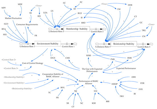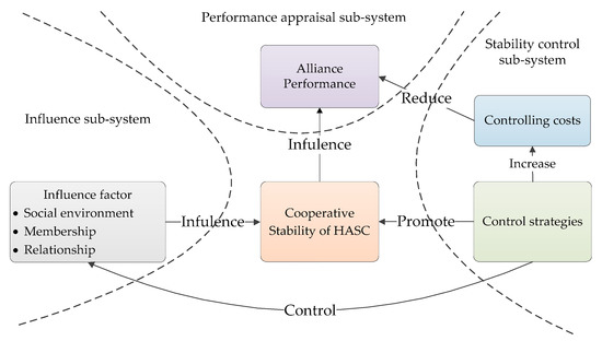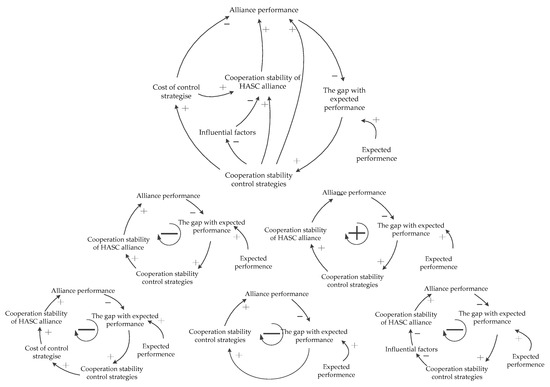 This study divided the cooperation stability system of the HASC alliance into three subsystems, influence, performance appraisal, and stability control, to more deeply investigate and design the cooperation stability. As shown in Figure 10, there are several factors (influence subsystem) that affect (positively and negatively) the cooperation stability at the alliance establishment and operation stage. This effect results in fluctuations in cooperation stability that cause an unsatisfactory performance of the alliance. This deficient performance further forces the alliance to implement strict control strategies (stability control subsystem). However, the control process will affect the cost, which in turn impacts the performance of the alliance (performance appraisal subsystem). Therefore, the enforcement of control strategies must be set in an appropriate range to match the strength of the alliance. The three subsystems are explained in the following sections. The causal loop diagram of the HASC alliance is shown in Figure 11, which has been used to derive the detailed model, as explained in the next section.