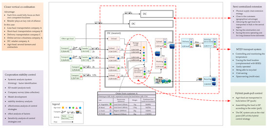 The home-oriented agri-food that is related to the customer’s daily life is one type of highly customized commodity. Various agri-foods must be ‘assembled’ according to the customer’s order. Moreover, due to the uncertainty rises from emerging AE markets, the demands for agri-food with a home-delivery service may fluctuate with time. Seeking to ensure that the HASC alliance has higher flexibility and robustness, we introduce the hybrid push-pull strategy in designing the supply chain of the HASC alliance. Specifically, since there are many distribution segments (branches) in the extended chain (after the DC stage), it is impossible to forecast the demand in each segment. The assembly process should be based on actual orders. Thus, pull control is more suitable for this stage. On the other hand, before ‘assembling’ the food into a ‘product’ in the DC, the total demand quantity of each kind of agri-food must be forecast according to the historical order quantity. Thus, push control is effective for the prior DC stages. Figure 6 shows a schematic diagram of the proposed hybrid control mechanism for the supply chain of the HASC alliance.