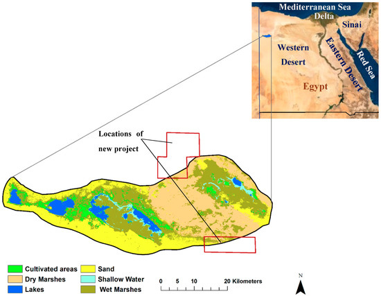 The Siwa region is located in the northwest area of the Western Desert in Egypt. It is a natural depression with an area of 0.28 million acres and an example of a closed basin where groundwater is the only source of water. Climate is arid to semiarid, where average annual rainfall is 13 mm and evaporation ranges from 5.2 to 17 mm/day [8,15]. Figure 2 identifies locations of the new proposed project in Siwa, which are away from the salty lakes and marshes.