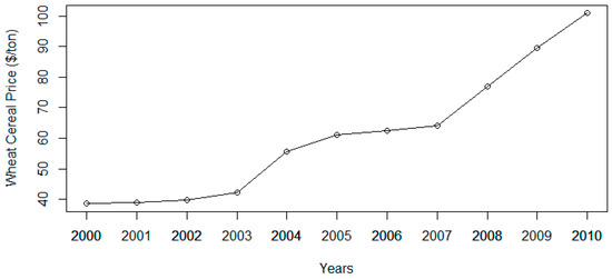 Time-series plot of annual price of wheat cereal from 2000 to 2010.