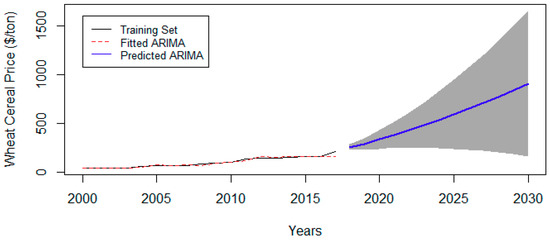 The results show that ARIMA (2,2,2) and (2,3,2) have the lower error values and are chosen to predict the prices of wheat cereal through 2011 to 2017 with 95% confidence level for prediction intervals. To identify the accuracy of these two models, the predicted data were compared with test sets using MAE, RMSE, and MAPE. The results show that values of MAE, RMSE, and MAPE for ARIMA (2,2,2) are 17.7, 21.5, and 11.3, respectively, while for ARIMA (2,3,2) these values are 13.4, 16.7, and 9.1, respectively. As a result, ARIMA (2,3,2) was selected to predict the price of wheat cereal with perdition intervals at 95% confidence level as shown in Figure 5. These steps are repeated to predict prices and production costs for all cultivated crops until 2030 and the corresponding ARIMA models are shown in Table 9. As a result, net revenues from these crops can be calculated.
