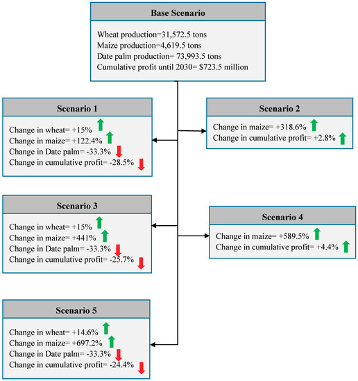 Figure 6 shows a comparison between the base scenario and the five scenarios in crop production and cumulative profits from 2020 to 2030.