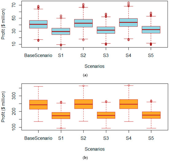 Box plot of profit from uncertainty analysis for all scenarios: (a) 2025 and (b) 2030.