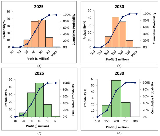 Histograms of profit with uncertainty: (a) and (b) base scenario for years 2025 and 2030, respectively, (c) and (d) scenario 5 for years 2025 and 2030, respectively.
