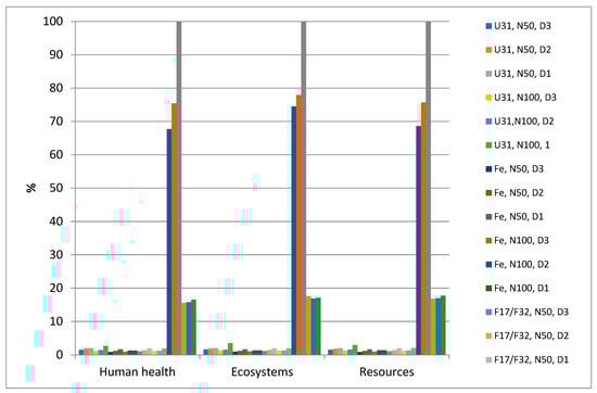 As above mentioned, the 22 impact categories can be summarized into 3 main areas. Figure 2 shows the overall vision of the impacts coming from the 24 scenarios evaluated. According to the method chosen, the impact in the 3 endpoints has been calculated by summarizing each impact of the categories impacting in that area. Moreover, the highest impact was set at 100% and the others have been accordingly compared.