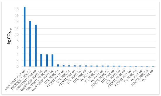 Carbon footprint of the 24 scenarios evaluated, expressed as kg of CO2. E68 = Epsilon 68; F17 = Fedora 17; F32 = Felina 32; F75 = Futura 75; Fe = Ferimon; S27 = Santhica 27; U31 = Uso 31; D1, D2, and D3 = 40, 80, and 120 plants m−2; N100 and N50 = 100 and 50 kg of N ha−1.