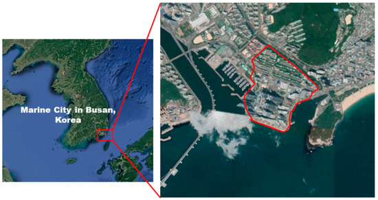The research area is the Marine City basin located in Busan, the Republic of Korea (Figure 1). The area is a residential-oriented town area that was built on a part of the land reclamation area of Suyoung Bay.