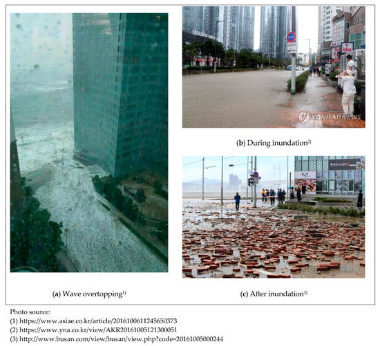 Many urban areas with various infrastructures are located in coastal areas, as the land of the Republic of Korea is situated in the Korean Peninsula and is mountainous [1]. Climate change due to recent global warming raises the risk of disasters occurring in those coastal regions. These disasters may be a result of a rise in the average seawater level and increases in rainfall intensity and typhoon strength [2]. Under these circumstances, the development of coastal areas through reclamation has increased the risk of flooding, which has caused loss of life and damage to property [3].