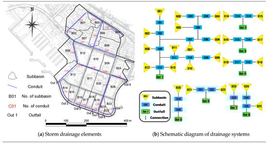The total watershed was divided into 25 subcatchments, and they were connected by 25 elements of storm sewers. The watershed runoff discharges to eight outfalls. The main drainage system of Marine City watershed is the system with the outfall element of Out 1 as the outlet. All the eight drainage systems directly discharge runoffs from rainfall to the sea. Figure 3 shows the watershed including the subcatchments connected by storm sewers and a schematic diagram of the drainage systems.