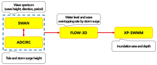 Meanwhile, XP-SWMM is also used to analyze rainfall–runoff of watersheds and ground surface inundation in coastal areas. Figure 4 represents the connection relations of the models used in compound flooding analysis in coastal areas and the results calculated by each model.