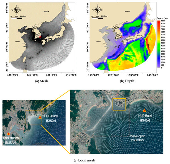 The storm surge and wave models were built using the ADCSWAN model. Table 1 provides important information on how to simulate the ADCSWAN model. The depth of the model used KHOA (Korea Hydrographic and Oceanographic Agency, http://www.khoa.go.kr/eng/) and GEBCO (General Bathymetric Chart of the Oceans) data, and air pressure and wind used the typhoon best track information of KMA (Korea Meteorological Administration, http://www.kma.go.kr/eng/index.jsp). For the sea surface wind, the Holland gradient wind vortex algorithm was applied, and the calculation area was set wide enough considering the effect of typhoons, and the grid resolution was composed of a triangular grid of at least 30 m with a maximum of 30 km (See Table 1). Figure 5 shows the grid and water depth map of the storm surge model constructed by the ADCSWAN model. Figure 6 and Figure 7 shows the analysis results of the tidal level and storm surge height and significant wave height of Typhoon Chaba. The results were compared with the observed data of the tide station in Busan and Haeundae Buoy for verification of the ADCSWAN model.