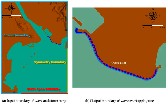 Figure 8a represents the area enclosed by the boundary conditioned by the input of the wave and storm surge of the FLOW-3D model; Figure 8b represents the boundary of the output-producing wave overtopping rate. Figure 9 shows the time series of the total wave overtopping rate per hour for the 32 grids calculated by the FLOW-3D model. The calculated total wave overtopping volume was 68,340 m³ from 8 a.m. to 12 a.m. on October 5, 2016 when Typhoon Chaba passed, and the maximum wave overtopping rate was 97.35 m3/s at around 9:20 a.m.