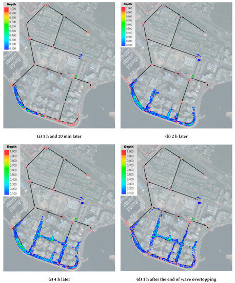Figure 12 shows the simulation results of flooding in Marine City over time during Typhoon Chaba. Wave overtopping started at 09:20, and it was shown that the inundation area increased over time. After the time of maximum wave overtopping, the wave overtopping rate decreased, and the floodwater on the road drained through the storm sewers into the sea, which resulted in a reduction in the flooding area.