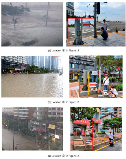 Figure 13 shows the five collected photographs for the flooding event and the corresponding spots of the maximum flooding area obtained from the simulation results. An area with inundation depth less than 10 cm was not considered as a flooding area. The matching of flooding between the simulation results and photographs reveals the adequacy of the simulation results for compound flooding. A field survey was also conducted for three locations to analyze the inundation results quantitatively. Figure 14 shows the images of the field survey for the sites to estimate maximum inundation depths, and the spots correspond to A, F and G in Figure 13. The analysis accuracy ranged from 88% to 92%, and the errors were less than 10 cm for the maximum inundation depths at the sites (Table 3).