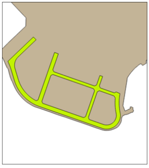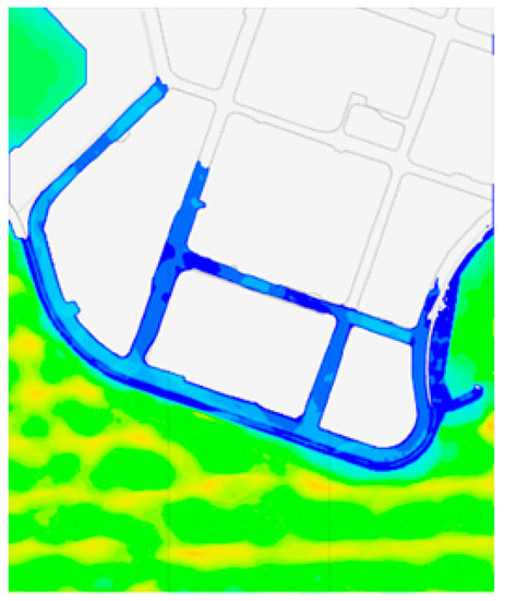 Meanwhile, Figure 15 is the archived inundation map of the Marine City area provided by the public data portal (https://www.data.go.kr/). Compared with the analysis results, it can be confirmed that the flooding area is quite similar to the inundation map. Specifically, the areas of inundation estimated by the archived inundation map and simulation results were 35,500 m2 and 34,776 m2, respectively; the simulated inundation area was 98.0% coincident with the archived inundation map. That is, the analysis procedures of compound flooding in coastal areas by linking flow simulation models of coasts and watershed were reasonably validated.