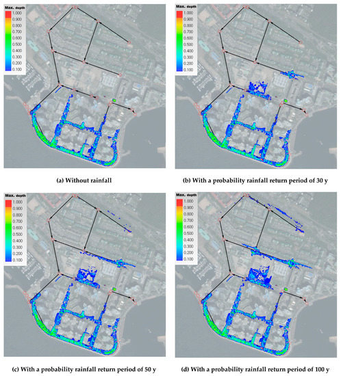 However, under conditions where rainfall is relatively large, the flooding phenomenon can be clearly reproduced by reflecting the rainfall–runoff only. The following analyses were performed in cases of increased rainfall under a certain storm surge condition to examine the inundation effect. The return periods of rainfall were 30-year, 50-year and 100-year under the 50-year frequency storm surge yielding wave overtopping and tide. The rainfall duration was 1 h and the time distribution followed a Huff curve for third-quartile storms. The center of rainfall hyetograph was set to coincide with that of the wave overtopping series.