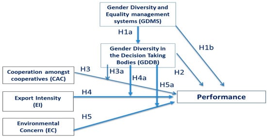 In view of this reality, this paper aims firstly to analyse the effectiveness of gender diversity and equality management systems (GDMS) in promoting gender diversity in the decision-making bodies of cooperatives (in terms of the percentage of women in them) as well as in the performance of the cooperatives. Secondly, the objective is to establish the relationship between GDDB and performance, and subsequently, to analyse the moderating effect of GDDB on three of the business strategies adopted by cooperatives in order to achieve competitive advantages and improve their performance: The first of these is the development of integration strategies through partnerships with other cooperatives to create larger organisations. The second is companies’ internationalisation strategies, through which they expand their markets and potential customers, and finally their environmental strategies, in this case, via cooperatives’ commitment to organic production. Along these lines, we argue that in cooperatives with GDDB, the effects of intercooperation, internationalisation, and environmental concern on performance are strengthened. Our analyses have controlled for the effects of organisational size and organisation type, as both factors have an influence on performance.