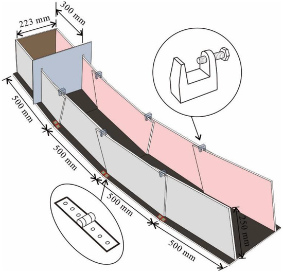 The constructed chute is comprised of four sections connected via six hinges that may be set to any desired angle through six U-shaped clips on the top of the apparatus. The storage bin is positioned on the upper portion of the chute. The bin gate is opened and closed through the pull and plug method. Moreover, the outlet end of the chute remains open, allowing the debris to exit freely along its longitudinal axis. Each separate chute has a width, depth, and height of 500, 223, and 250 mm, respectively. The internal dimensions of the storage bin are 300 × 223 × 250 mm. The chute is formed of 8-mm thick acrylic plates. The front wall incorporates a membrane to avoid any interfering reflections on the digital cameras. The back wall has graph paper with 10 × 10 mm squares, which facilitates the post-image identification. The bottom surface has a variety of different patterns printed, which improve the quality of the obtained measuring results. The perspective view of the chute is shown in Figure 1.