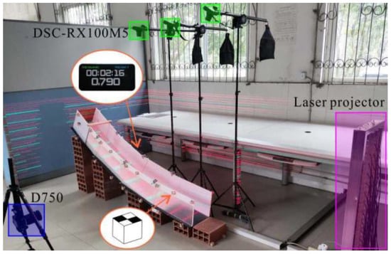 Three Sony DSC-RX100M5 digital cameras are mounted on top of the chute apparatus to record super slow-motion videos during the experiment. The time is measured by a millisecond stopwatch timer throughout the experimental process. The dynamic behavior and deposit features of the experiment are recorded by a Nikon D750 DSLR camera, which is mounted on a tripod on the right side of the chute. To verify the availability and applicability of the method, a number of parallel and equally spaced fringes are projected onto the bottom surface of the chute via a laser projector. A certain number of photo-control points must be distributed in the camera’s fields of view so that the experimental data can be oriented in a defined coordinate system. The visual perspective of the experimental facility is shown in Figure 2.