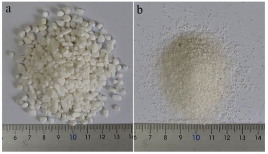 Two different granular diameters are chosen as the experimental object. These are the granular diameters of polished gravel ranging from 4 to 6 mm (Figure 3a) and of quartz sand of approximately 30 mesh (Figure 3b). At a debris weight of 22.4 kg, the volume of fine gravel is 13,997.1 cm3 and the volume of quartz sand is 17,535.6 cm3.