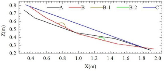 The slope angle is fixed at several values to study the dynamic and deposit behaviors of debris. Different shapes are employed, respectively, from A to C. Shape A has evident buffering units at the second and third slopes; the slope angles are 36.3°, 19.7°, 8.7°, and 17.9° from top to bottom. The slope angles of shape B are 34.4°, 26.6°, 14.5°, and 7.9° from top to bottom, making the transition relatively smooth. Shape C is held at a constant 19.9° angle at all times. Spherical crown-shaped barriers are provided at upper and lower portions on the bottom surface of the chute. The radius and height of the spherical crown are 45 mm and 35 mm, respectively. The coordinates of the center of the upper and lower spherical crown are (x, y) = (800, 540) mm and (x, y) = (1300, 365) mm, respectively. The regions where the barriers are located present slopes of approximately 26.6° and 14.5°, respectively. The slope profiles of the chute are shown in Figure 4.