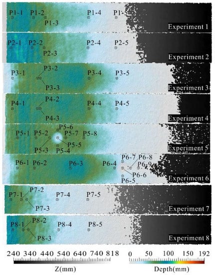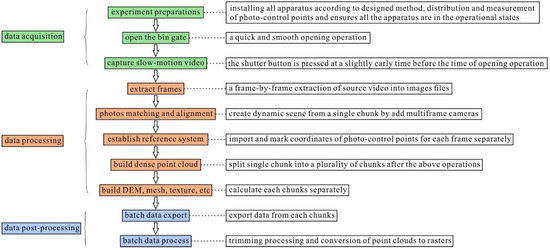 The 3D spatial data of dynamic scenes over time include point cloud data, DEM, mesh, texture, etc. As the main purpose of the study is to analyze the dynamic behavior of debris under various experimental conditions, this can be completed by post-processing the point cloud data. Certainly, other data can also be used in the analysis of these experiments for various research purposes. For example, reference data or a corrected model for numerical simulation based on mesh data and basic data of dynamic scenes for virtual reality (VR) obtained from texture data could be useful in widening the application fields for earth science researchers.