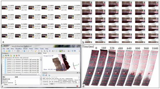 Before the 4D reconstruction, the frame-by-frame extraction of the source video into images files must be completed (Figure 6b). There are numerous software programs implementing these functions currently on the market. So far, a major reason for the limited implementation of photogrammetry at a high temporal rate is the lack of a multi-sensor synchronization image capture systems. To solve this problem, the millisecond stopwatch timer is first used to measure the synchronization data in this study, that is, a set of images extracted from the source video at the same point in time may be grouped to belong to one group. Each set of images can create a 3D scene at that point in time by the photogrammetric software.