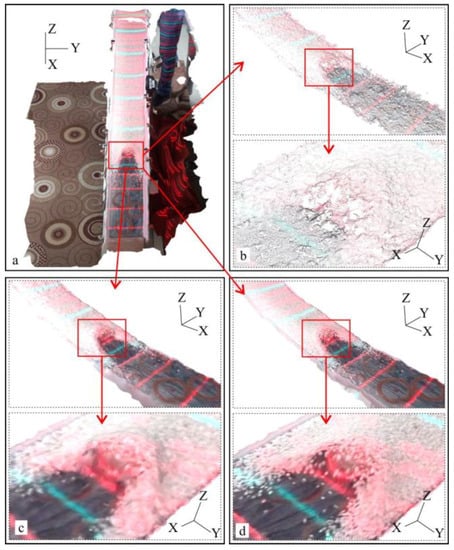 3D spatial data of Experiment 6 at 840 ms. (a) Panoramic data of original data; the local magnified data of (a): (b) point cloud data, (c) mesh data, and (d) texture data.