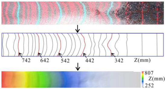 To verify the availability and applicability of the method, the terrain data from the projected fringe method were compared with the photogrammetry results. The application of the projected fringe method has been widely used in the fields of manufacturing, medical sciences, computer sciences, homeland security, and entertainment [40,41]. The basic operating principle of this method is to capture transient states as contour lines generated by projecting horizontal lines on an inclined plane via a laser projector, relating the deformation of the lines to surface elevation. The data acquisition workflow is illustrated in Figure 9.