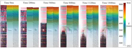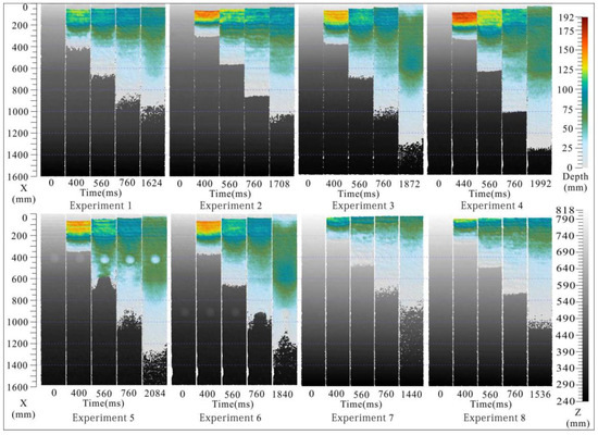 3D spatial data at a certain point in time include point cloud data, DEM, mesh, texture, etc. as seen in the results of Experiment 6 at 840 ms shown in Figure 7. In this example, the pixel resolution reaches 1.19 mm/pix and the precision of this method is comparably high, sufficient to capture the textural details of the debris surface. The above spatial data may be chosen according to the application requirements. Here, the point cloud data are chosen to systemically study the dynamic behavior and deposit features of the debris avalanche.